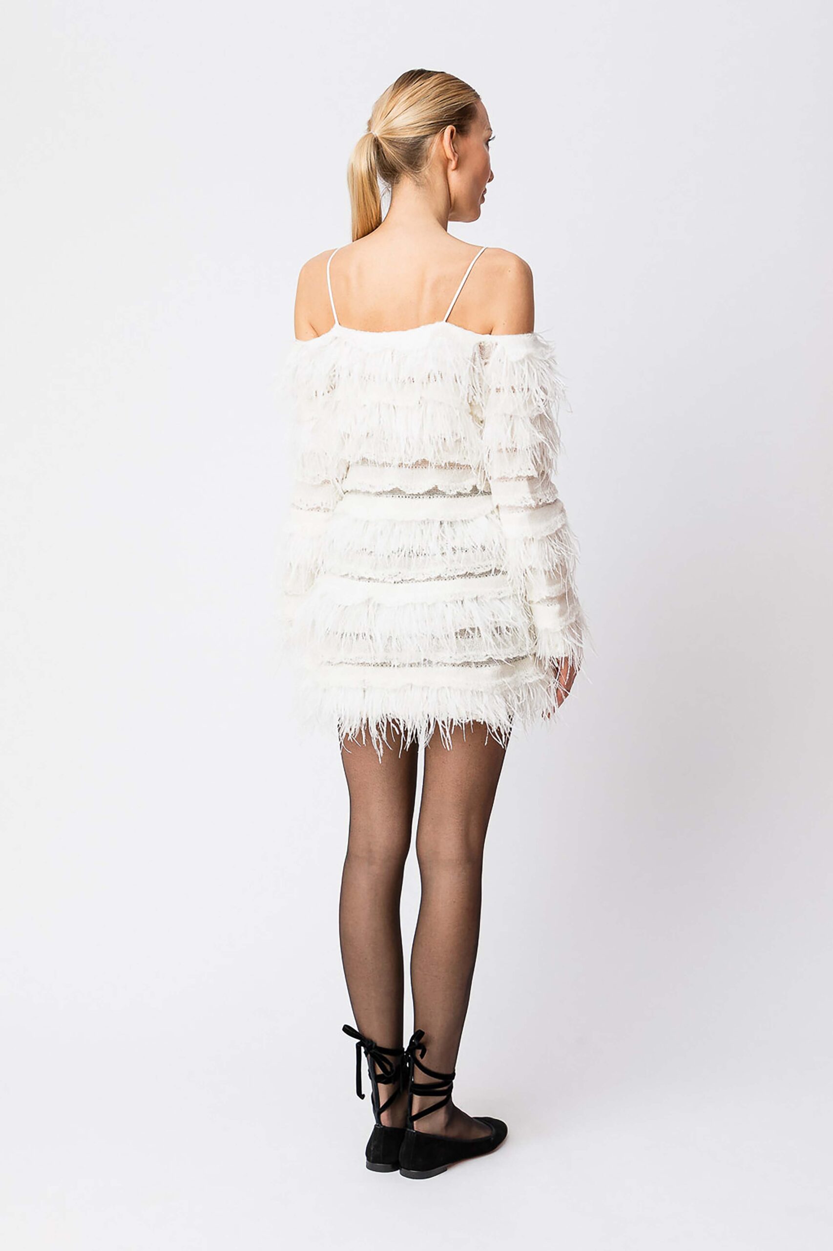 Къса плетена рокля с открити рамене и редуващи се волани и пера, разположени хоризонтално, които придават обем на дрехата. Тънки презрамки, дълги ръкави, свободна кройка.