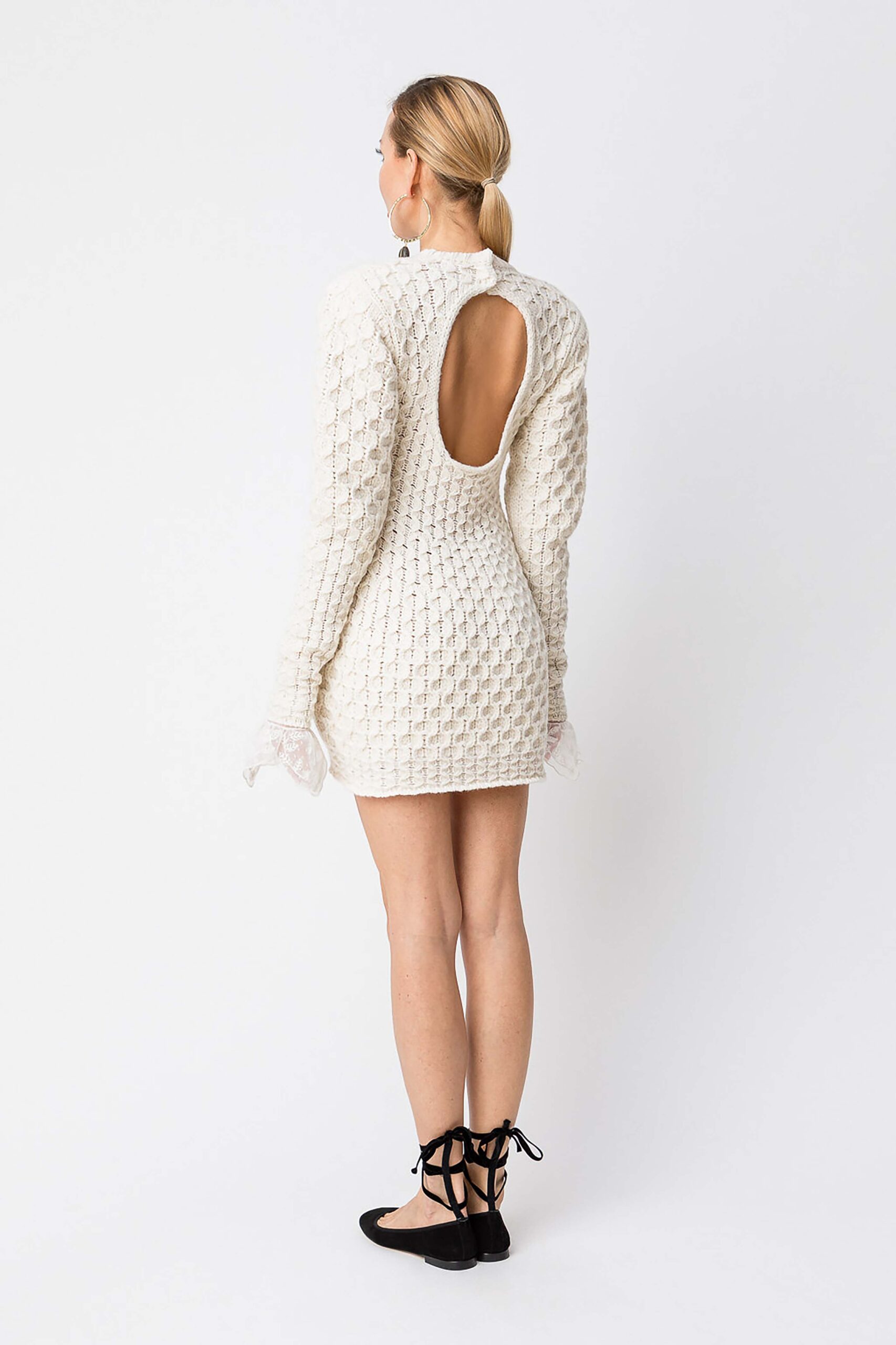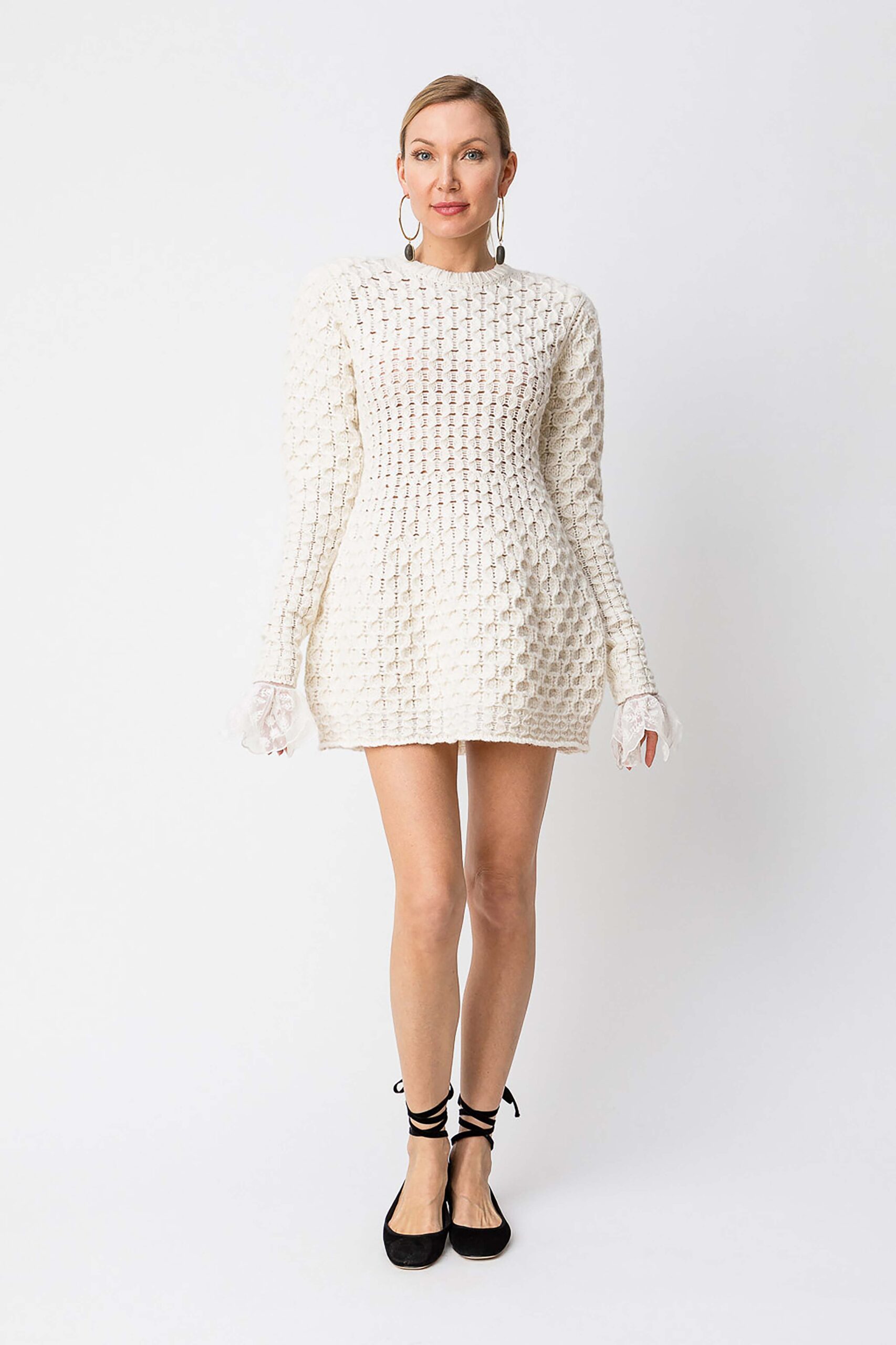 Къса рокля от вълна и кашмир с 3D диамантен мотив и деградиран ефект. Обло деколте, дълги ръкави, разкроена задна част, разкроена кройка.