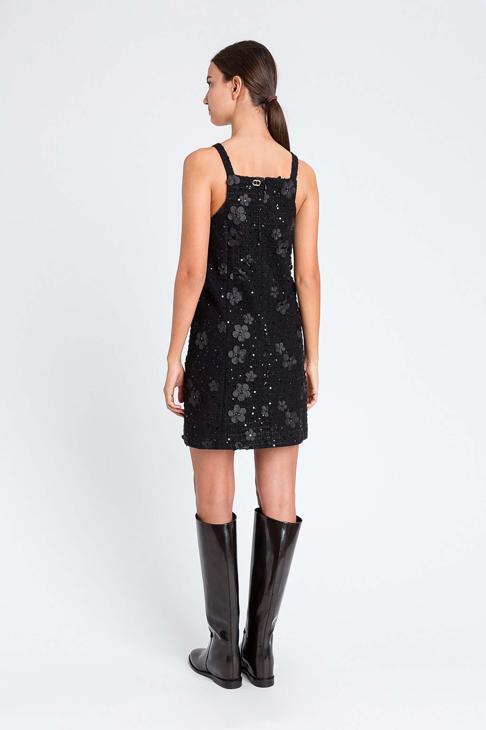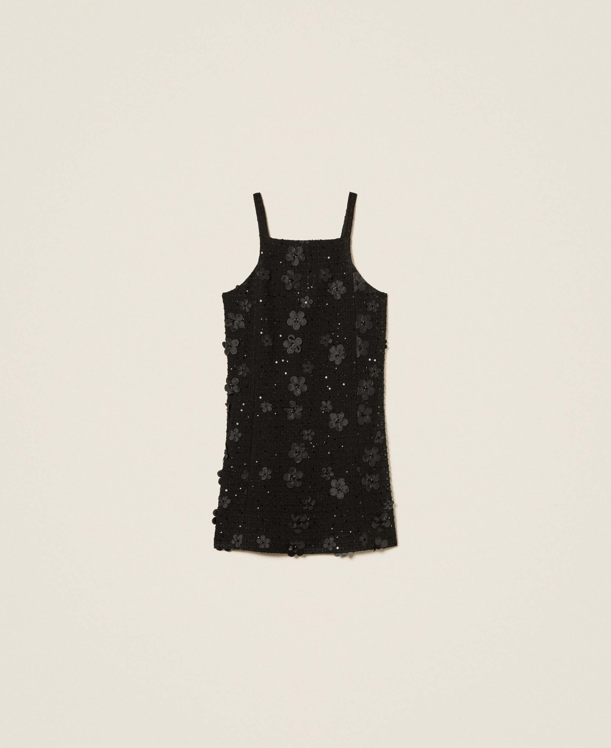 Къса рокля от букле с триизмерна бродерия на цветя. Без ръкави с широки презрамки и квадратна яка, скрит цип на гърба, подплата, права кройка.