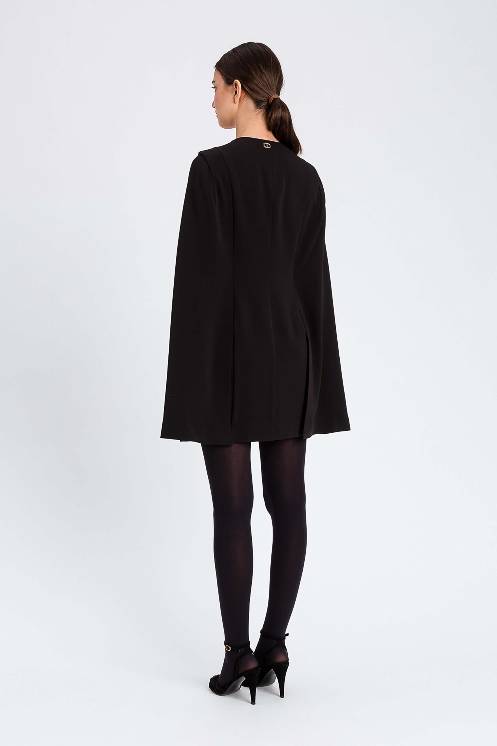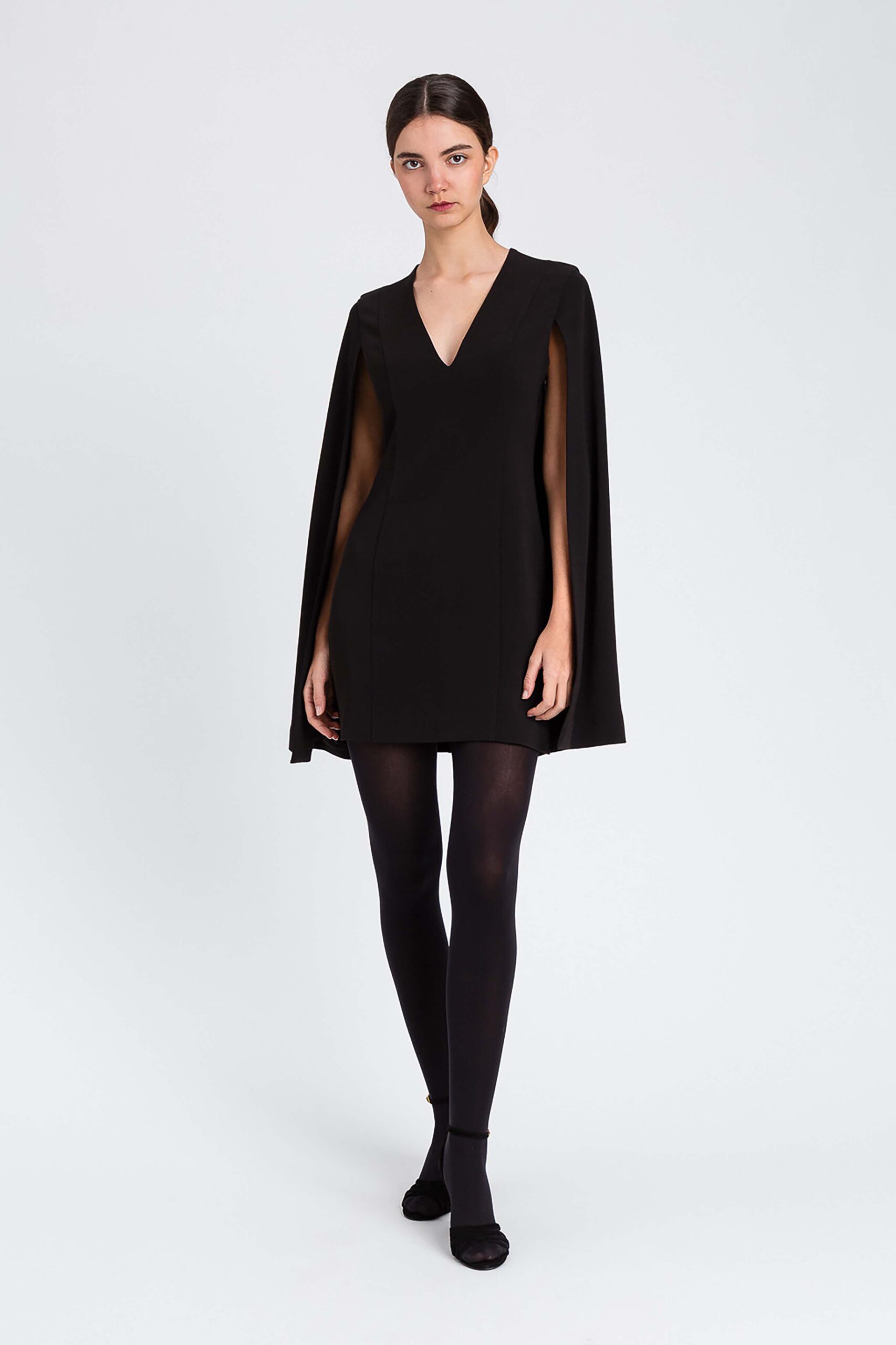 Къса креп рокля с широки отворени ръкави с ефект на пелерина. V-образно деколте, закопчаване с цип, подплата, вталена.