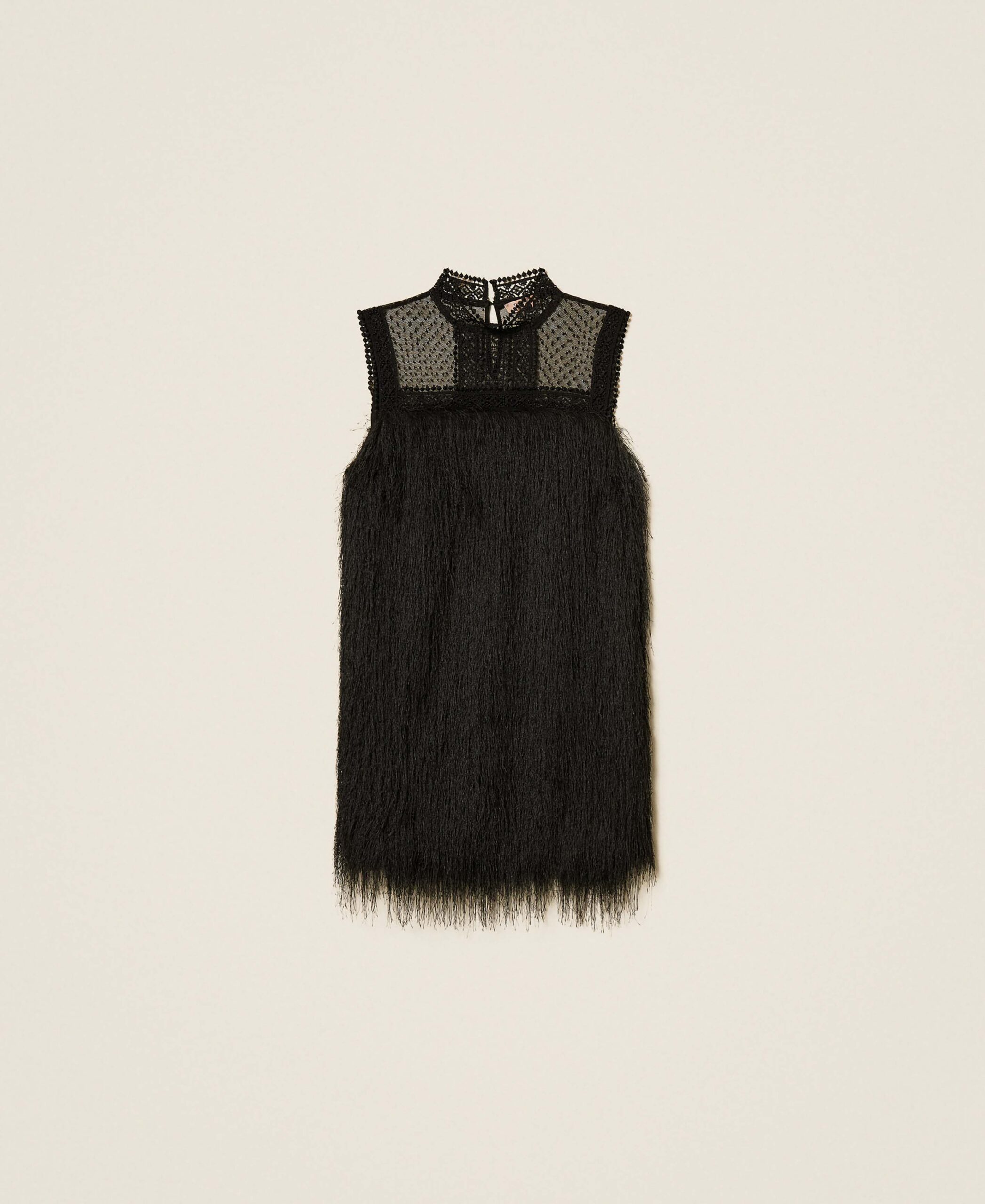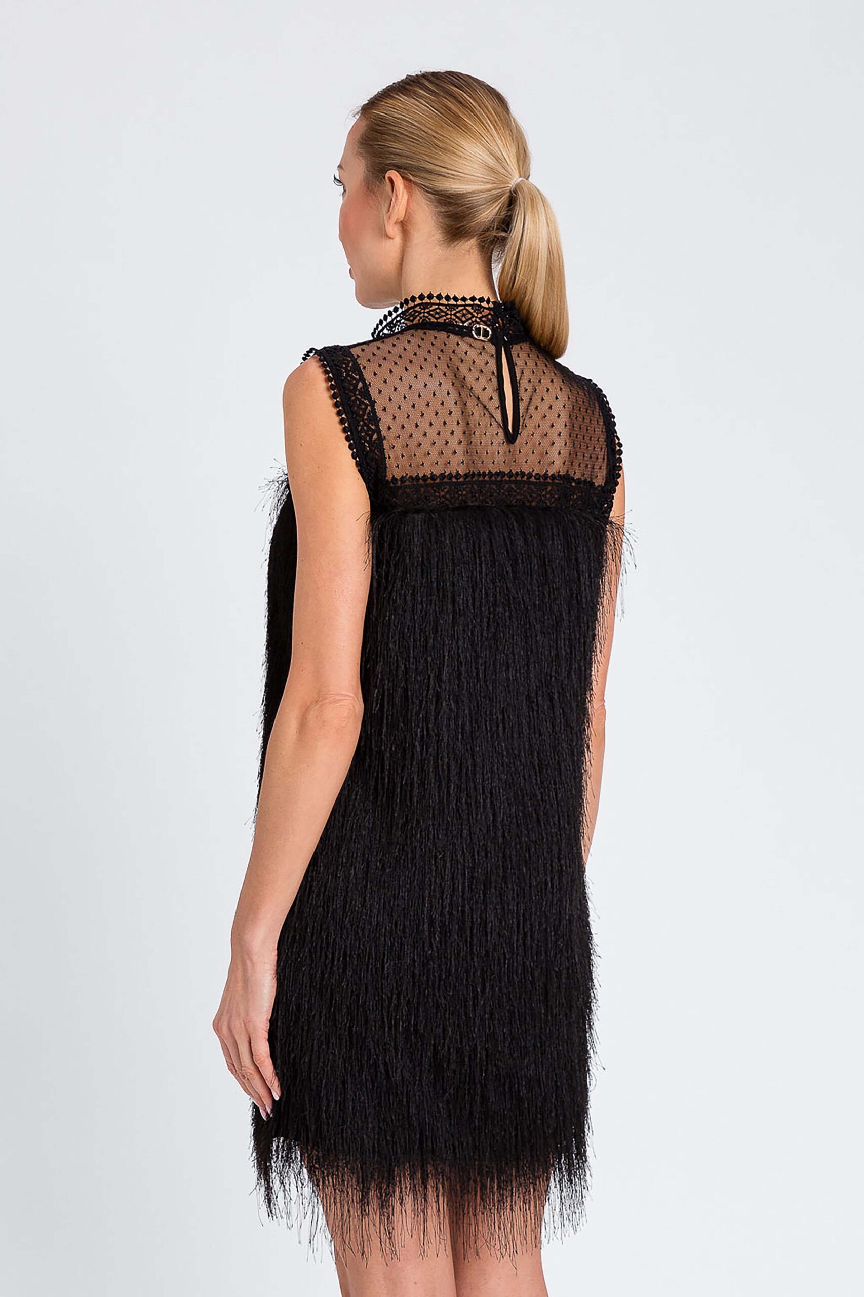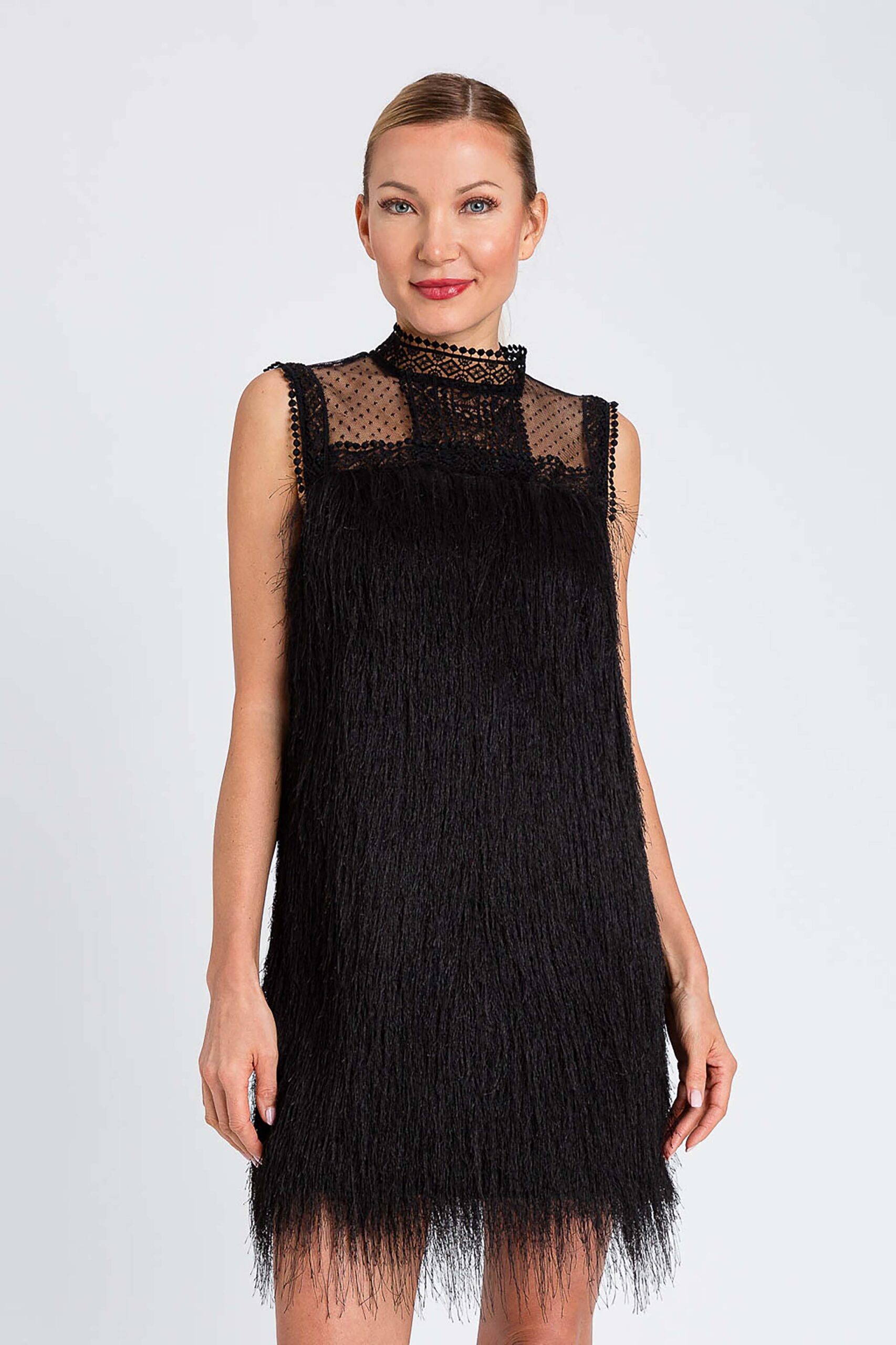 Къса рокля от ресни с яка от тюл плуметис и дантела. Без ръкави, обло деколте, закопчаване тип „сълза“ с копче на гърба, подплата, права кройка.
