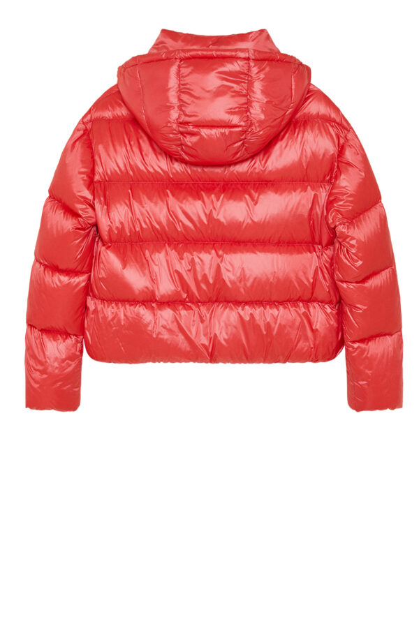 Късото пухено яке с качулка на Patrizia Pepe се характеризира с лъскава ултра лека найлонова материя с блестящ ефект и детайл муха на ципа. Качулката се сваля.