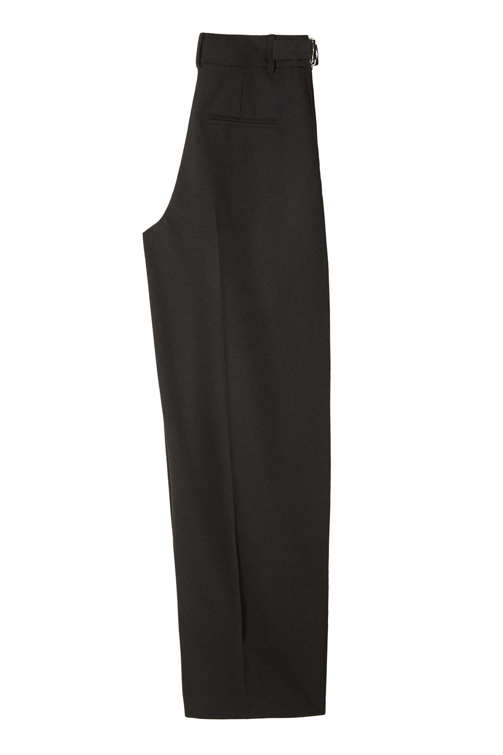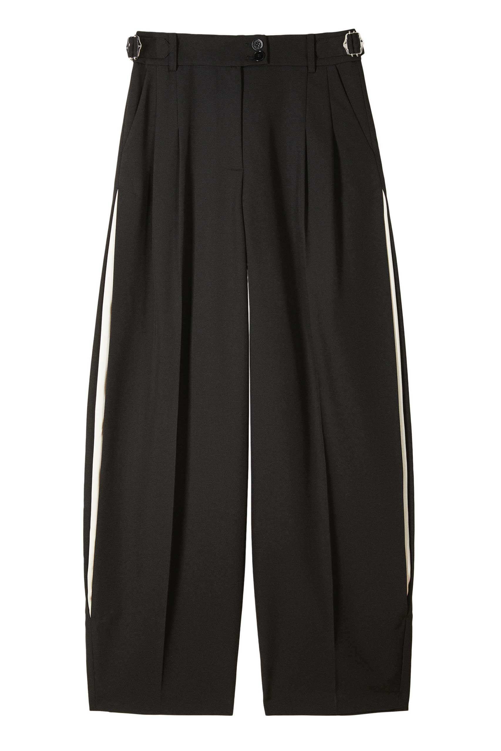 Този панталон тип „палацо“ се отличава с широк силует и прецизна кройка. Контрастните сатенени вложки подчертават плавното драпиране, а закопчаването с двойно копче и регулируемият колан позволяват персонализирано прилягане. Съчетайте го като костюм с подходящото сако или с вталени трикотажни изделия – универсална дреха, създадена за непринудена ежедневна и вечерна визия.