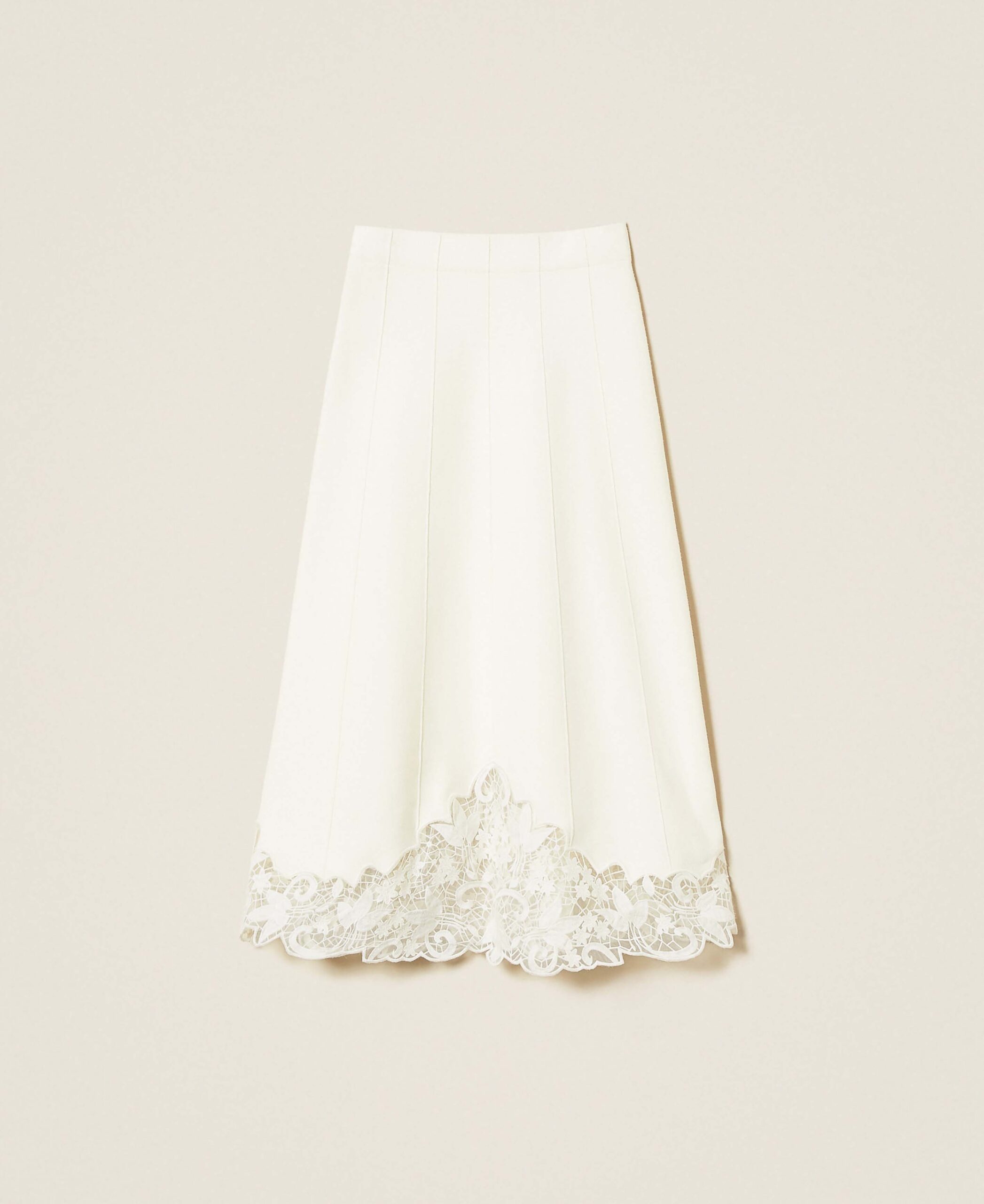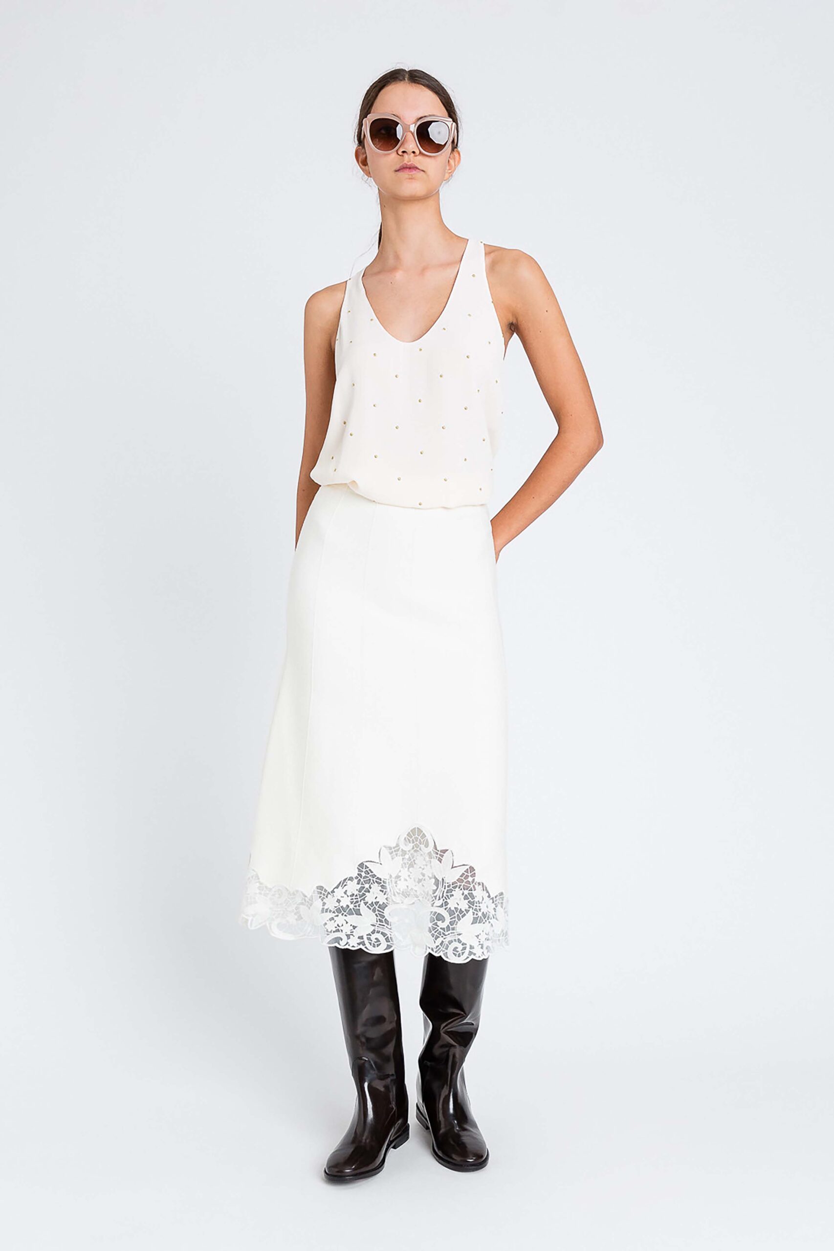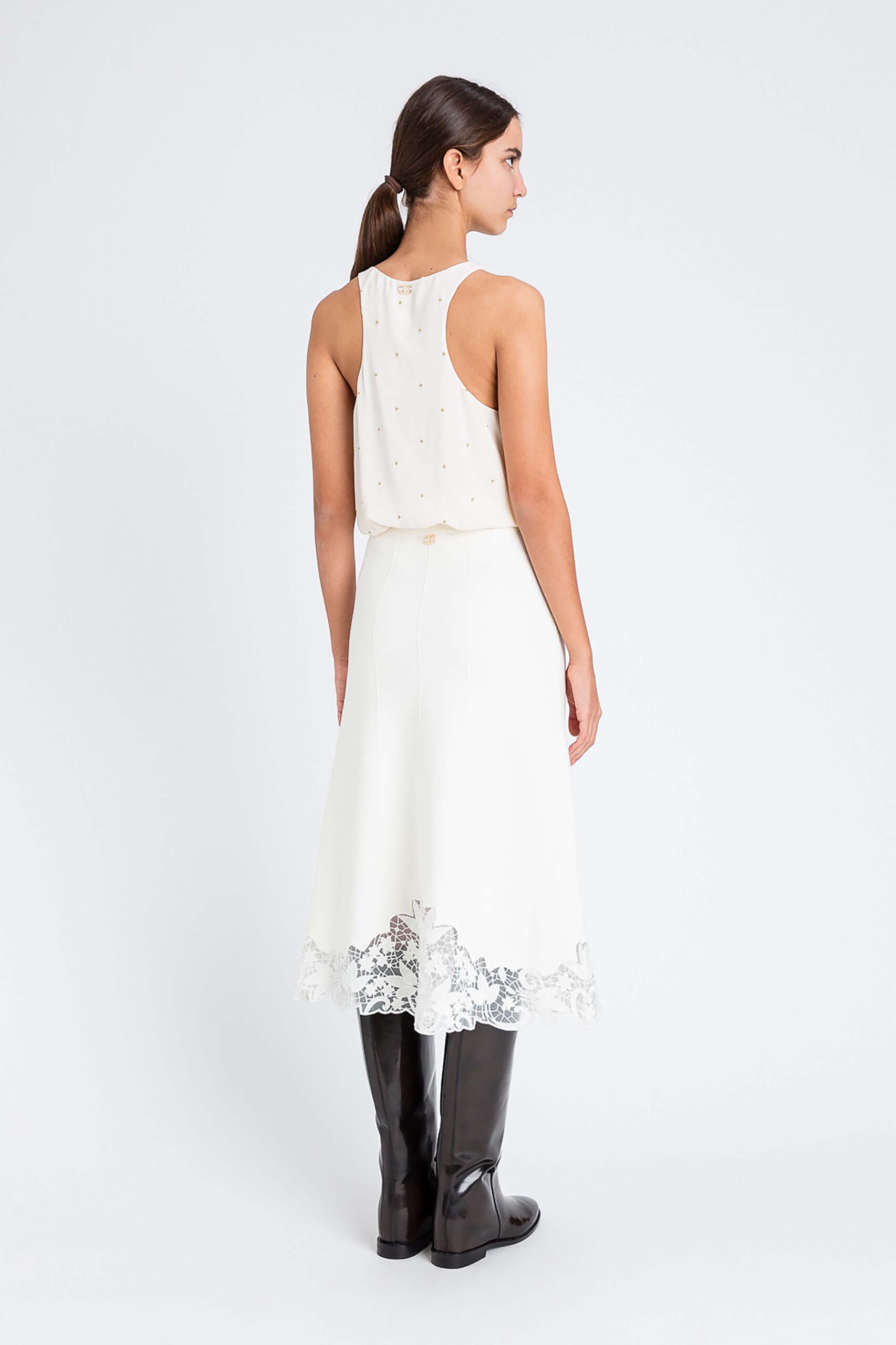 Вискозна, едноцветна плетена миди пола с вертикален шев и бродиран органзен подгъв. Еластична талия, плочка с лого Oval-T на гърба, леко клоширана.