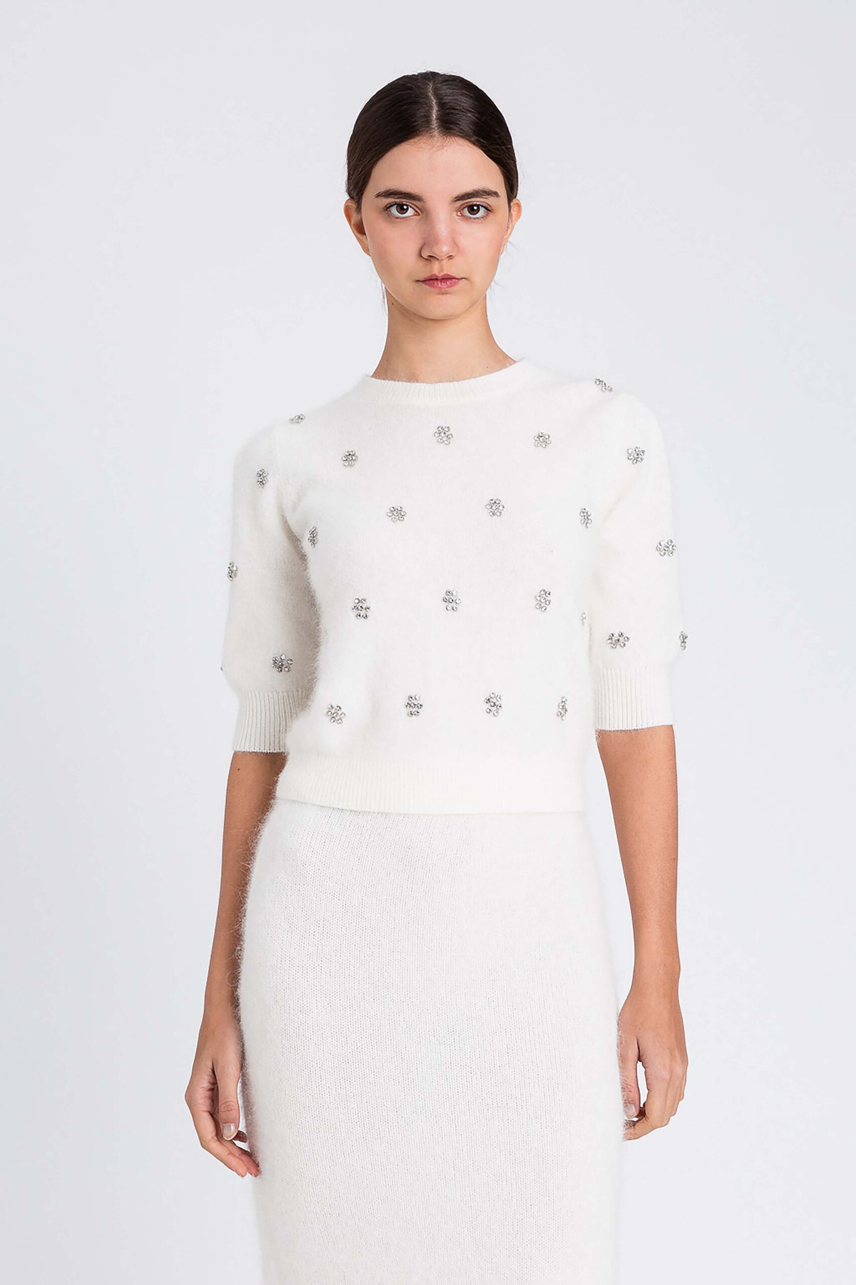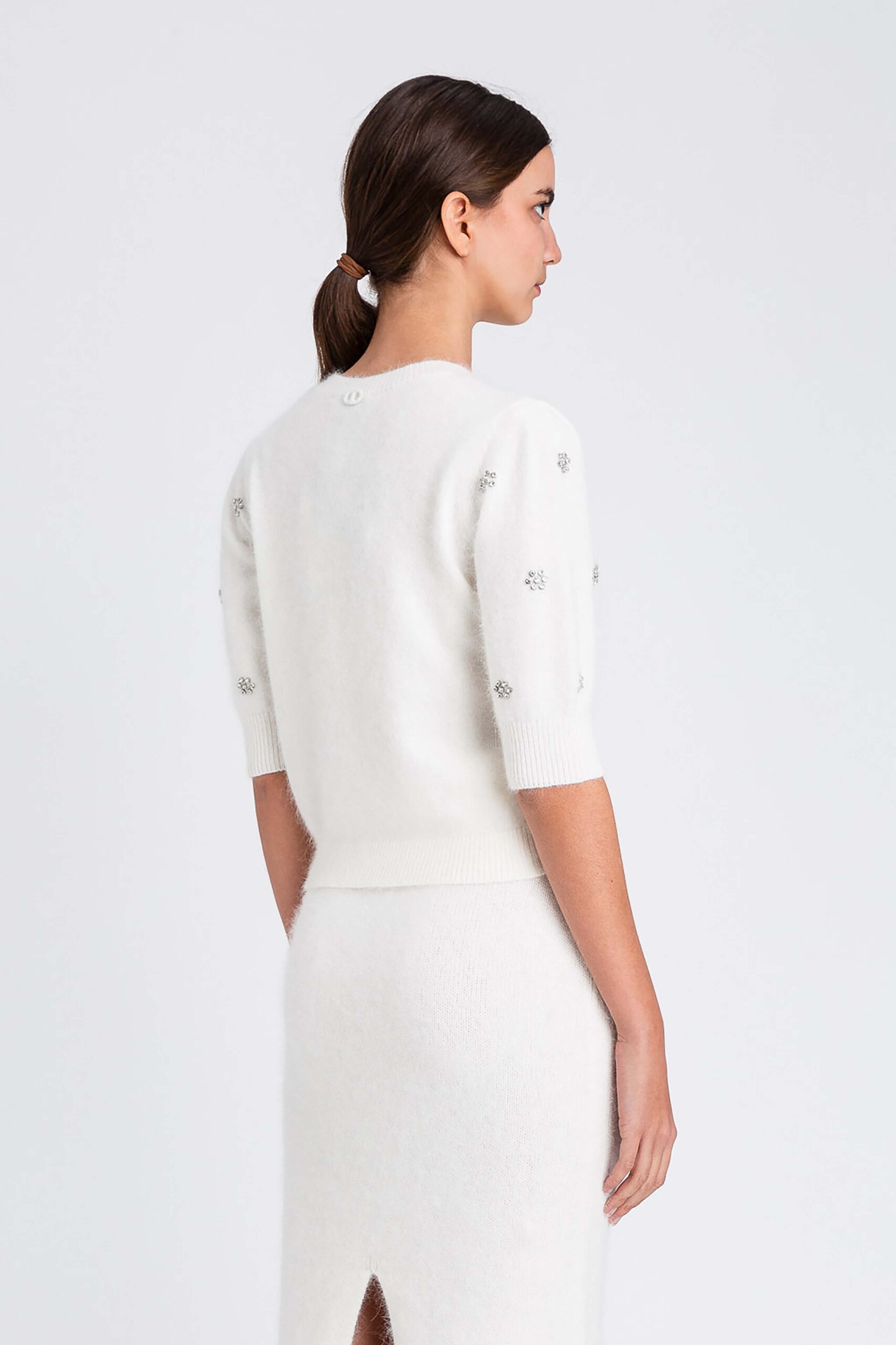 Пуловер от ангорска смес с гладка плетка и апликации от нитове, образуващи цветя. Пуловерът е с обло деколте, къси ръкави, плочка с лого Oval-T на гърба и свободна кройка.