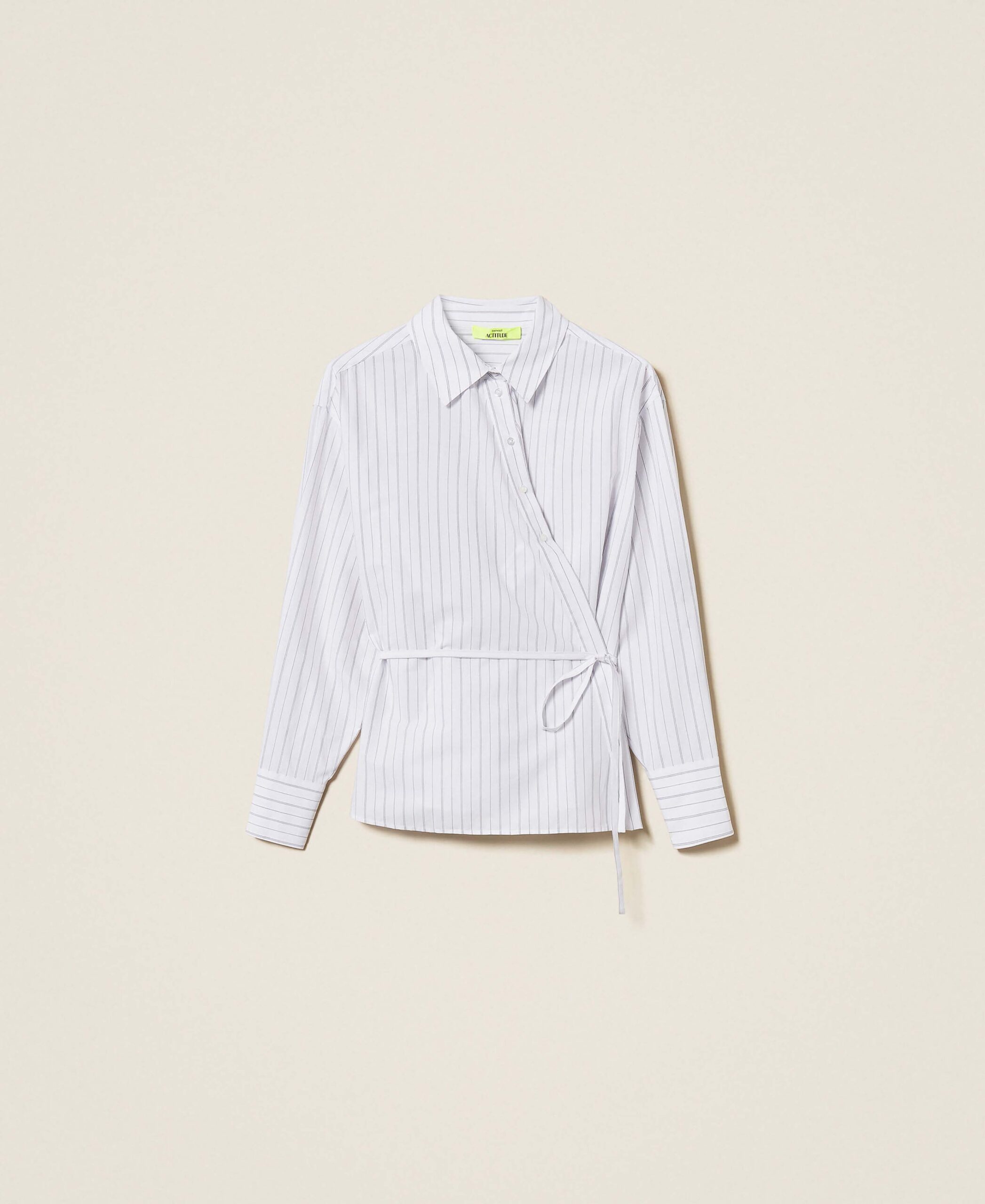 Риза тип „прегърни ме“, проектирана от артиста Myfo за колекцията Actitude, изработена от раиран поплин с контрастна бродерия. Закопчава се с копчета и регулируеми връзки, заоблени страни, свободна кройка.