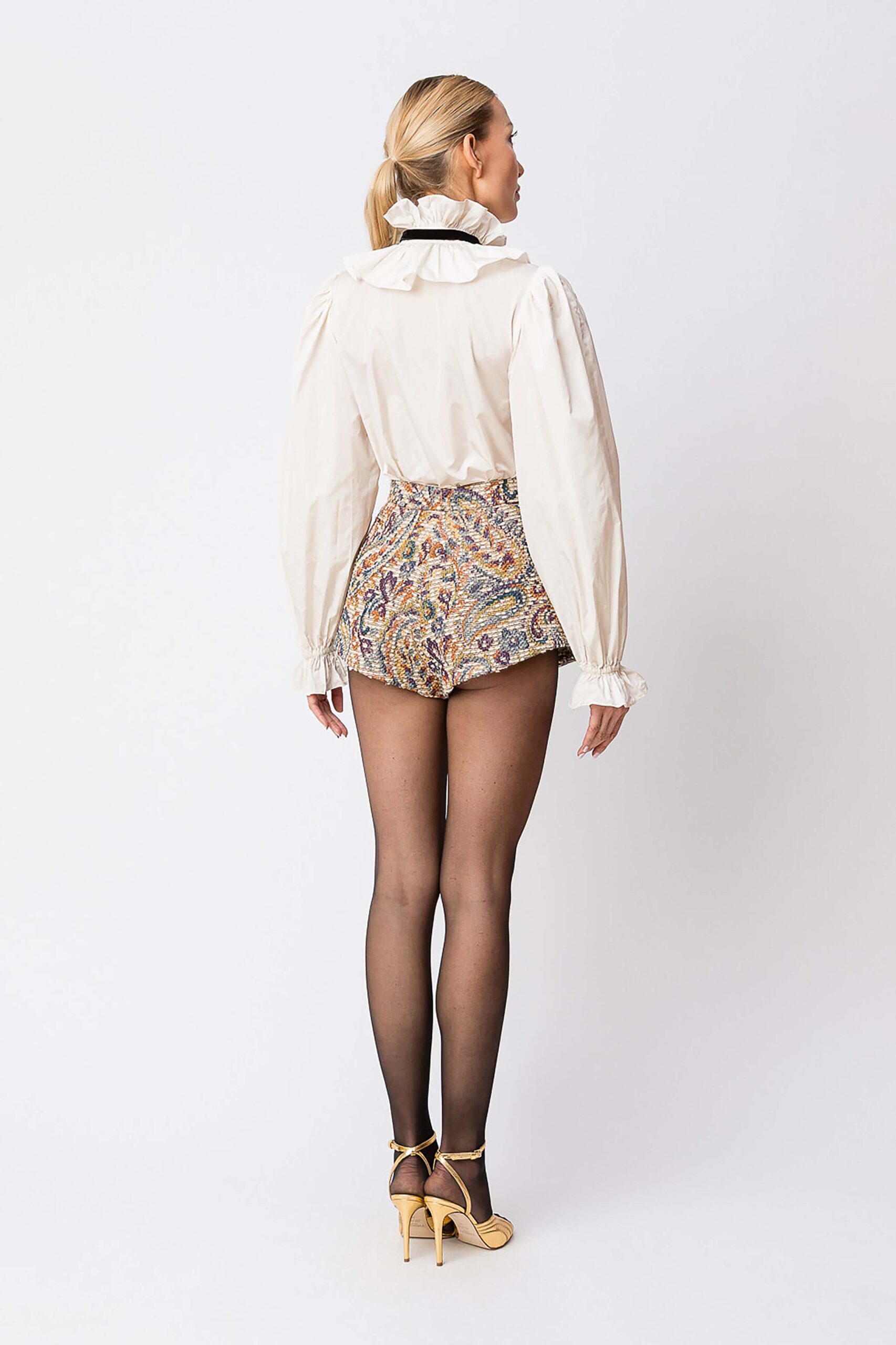 Риза от тафта, лека материя с чисто усещане, произведена в Италия. Стояща яка с набран волан, закопчана с контрастираща кадифена панделка. Обемни ръкави, ластични маншети с волани, закопчаване с прикрити копчета с вертикални плисета, права кройка.