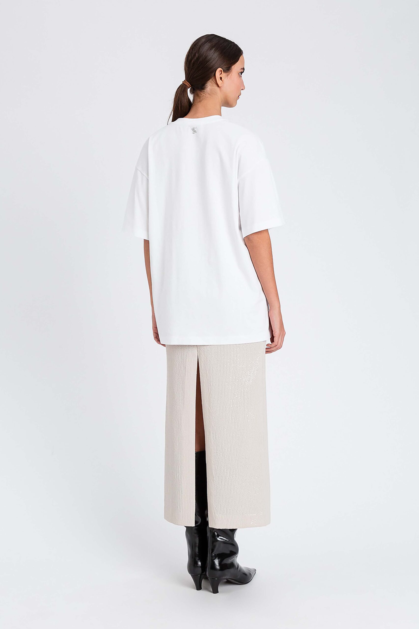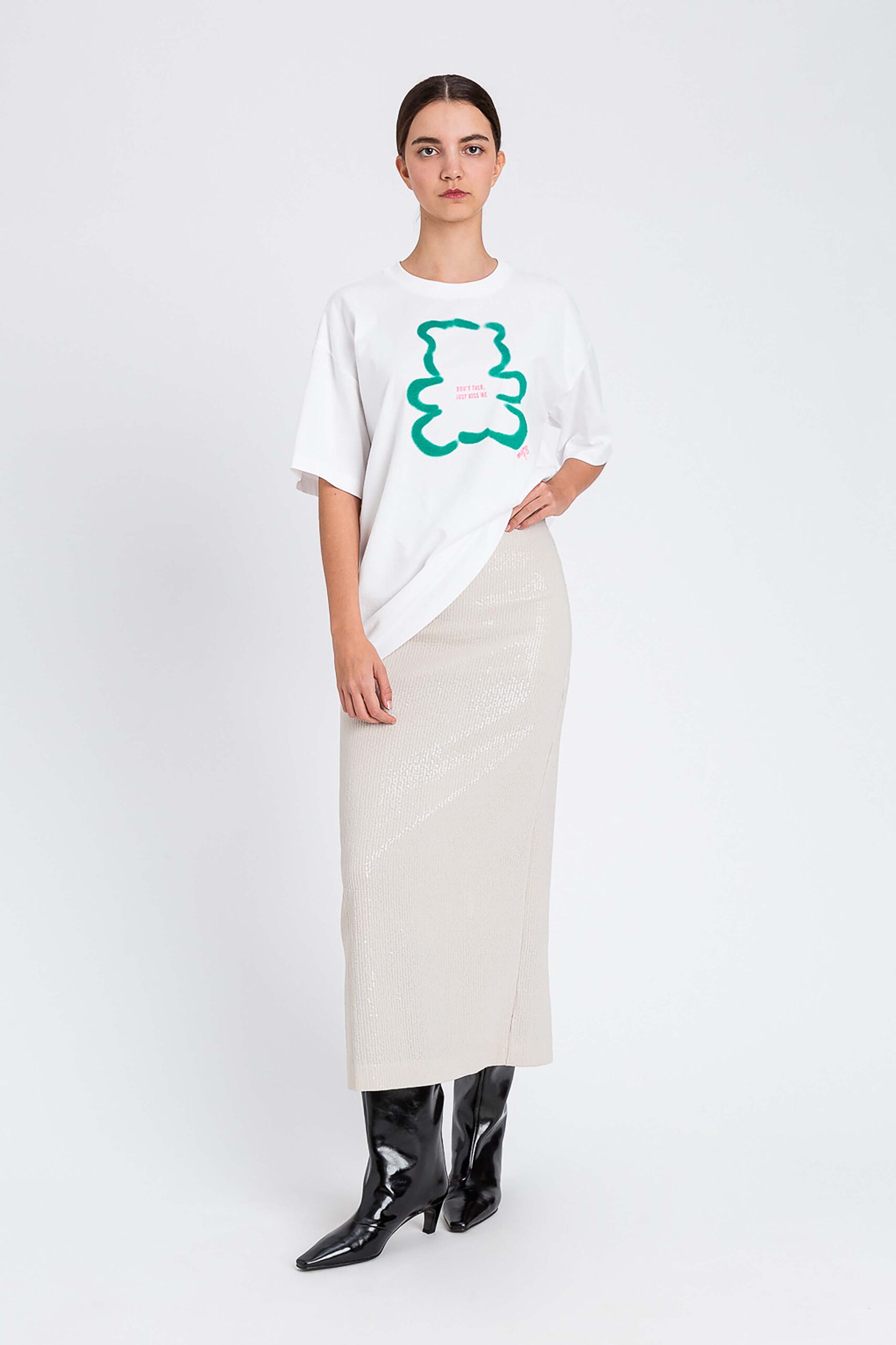 Тениска, проектирана от артиста Myfo за колекцията Actitude, изработена от мерсеризиран памучен трикотаж с щампа. Оувърсайз.