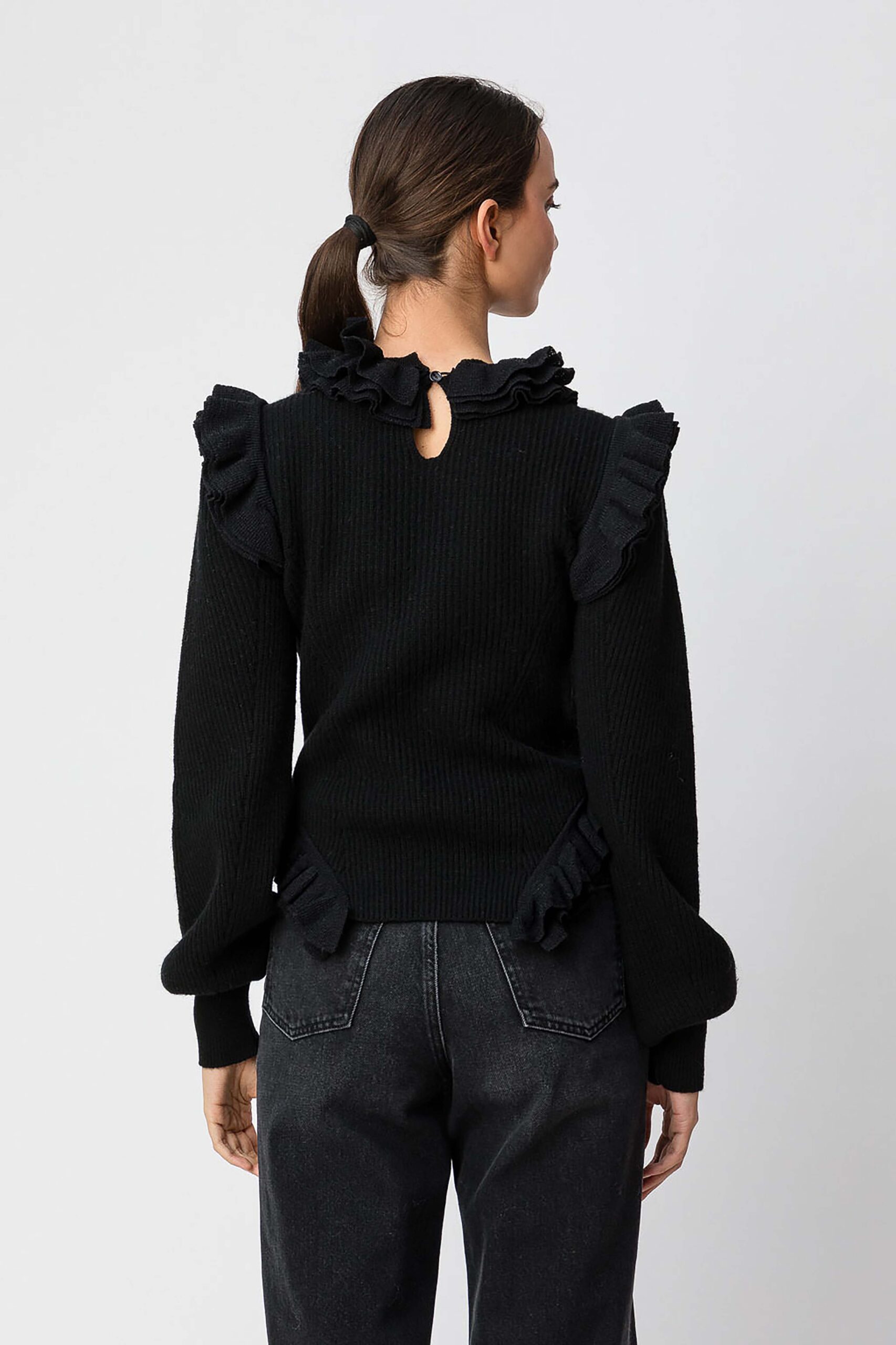 Пуловер от вълна и вискоза. Леки волани за създаване на обем. Поло яка, дълги бухнали ръкави, диагонални шевове, подчертаващи силуета, вталена кройка.